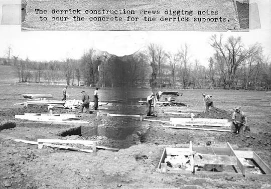 The derrick construction crews digging holes to pour the concrete for the derrick supports at the Campbellsville oil well in 1947.
